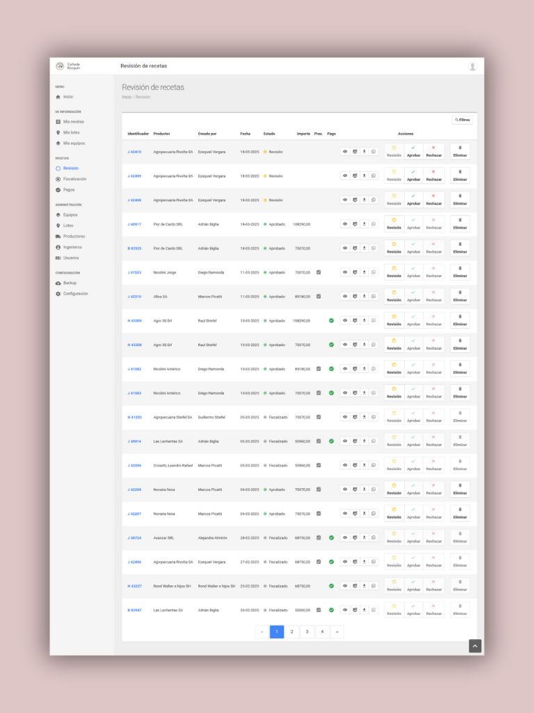Ho sviluppato una piattaforma web su richiesta di una comune in Argentina per la gestione dell’applicazione di prodotti fitosanitari nella regione. Il sistema permette: