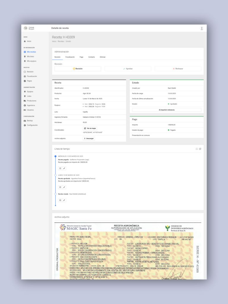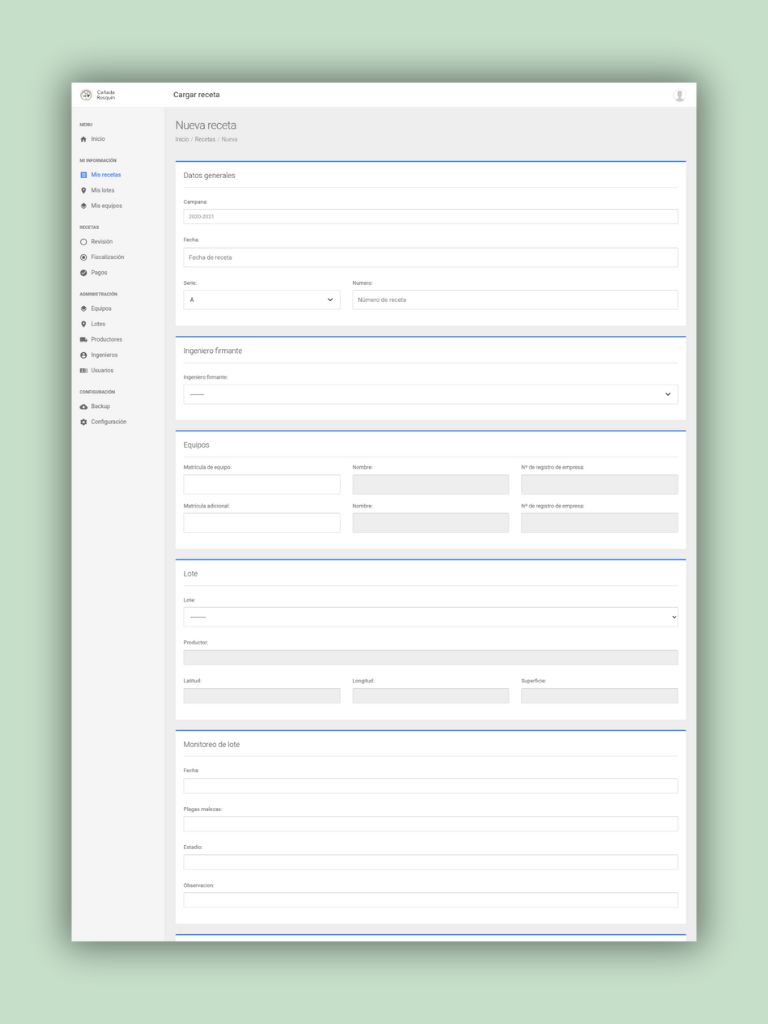 Ho sviluppato una piattaforma web su richiesta di una comune in Argentina per la gestione dell’applicazione di prodotti fitosanitari nella regione. Il sistema permette: